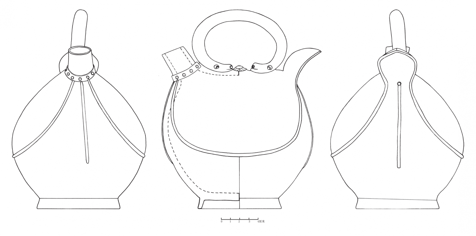 皮囊壶。壶身上扁下圆,呈皮囊状。上有提梁,提梁上部中间戳印三枚圆珠纹;左右两侧和腹部各有一条凸起线;腹部一侧有短直流,根部戳印一周圆珠纹,与其相对的另一侧翘起一羽状尾,尾下有一小孔;提梁下端与壶体的连接处,做成相对的螭首形,两螭首相对的中心部位堆塑荷叶状小钮,其上有珠状凸起。圈足外撇。浅灰胎,通体青釉,釉色呈湖绿色,釉面莹润。足端有一周垫烧泥点痕。