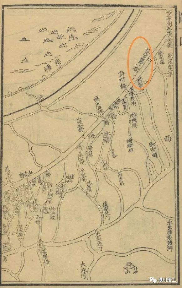 关于盐官第一桥的信息很少,检民国《海宁州志稿》,仅有“盐官第一桥,在许村西”(卷3《桥梁》,页14b)的简单记录。翻检前志,《州志稿》中的此条记载实引自乾隆《海宁州志》。