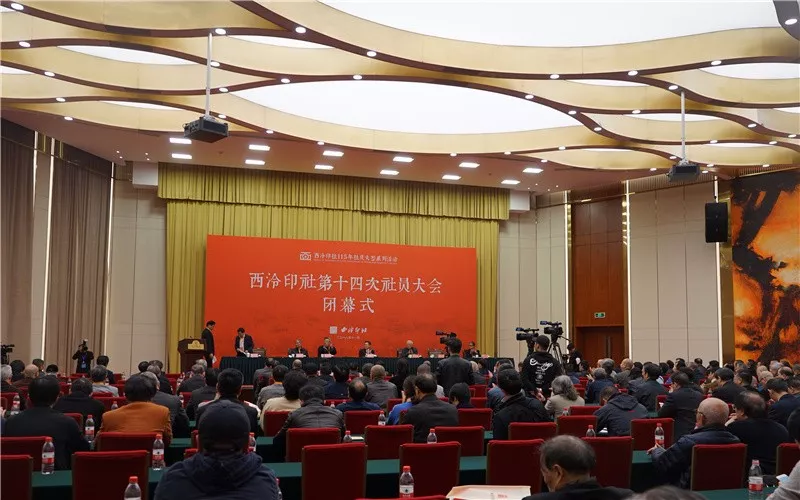 上午10时许,西泠印社第十四次社员大会在之江饭店召开,会议选举产生印社新一届理事会,上一届73名理事全部续任并新增了张炜羽、陈中浙、铸公3名理事,总数达到76名。社员大会还审议并通过了新的《西泠印社社团章程》及《工作报告》。新章程为今后西泠印社规范化、制度化、目标化运作提供制度保障和目标指引,工作报告中提出未来五年西泠印社建设总体规划、发展目标和工作思路,在加强党的领导、规范依法治社、提升学术品质、加强社会服务、扩大文化传播和加大创新发展力度等方面提出工作要求和计划。