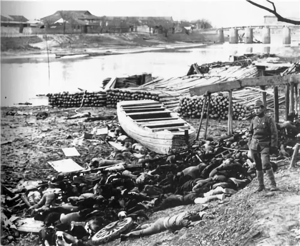△日军将失去战斗力之中国军人反绑双臂、集体杀戮后掷入水池中。池水被鲜血染红,此池中遗体达300余具。