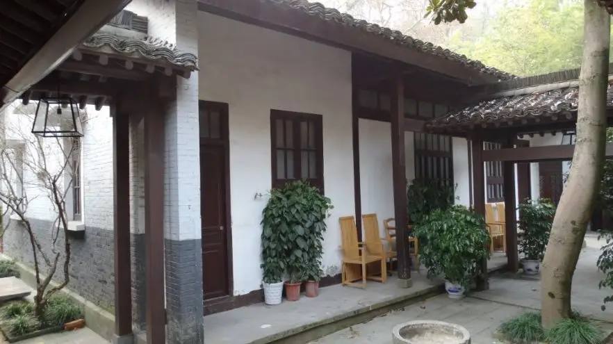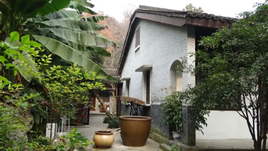 在西湖侧畔的隐谧乡间,有一幢别墅前后均有花园,院内种有紫薇、红枫、碧桃、腊梅等众多植物,恍如一个花草世界,这里就是龙井蒋宅。龙井蒋宅位于西湖区龙井373号,建于民国时期,坐北朝南,是一座砖木结构的悬山双坡顶别墅,三开间带阁楼,二厅四室,建筑面积150余平方米。别墅南面带外廊,廊的东西两侧均有砖叠拱券,整幢建筑的门、窗等构件均雕刻精美。
