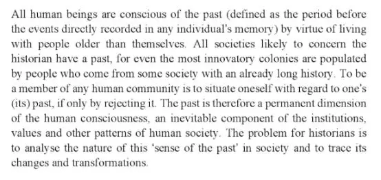 但记忆难免有偏差,学习常常有误解,所以,针对一个社会的全部“过去的事情”,需要社会中经过专门训练的人来研究,这就是历史学家们的工作。英国当代著名历史学家霍布斯鲍姆在《论历史》一书中给出的定义是:“分析社会中‘过去感’的本质,并追溯其变迁与转型”。