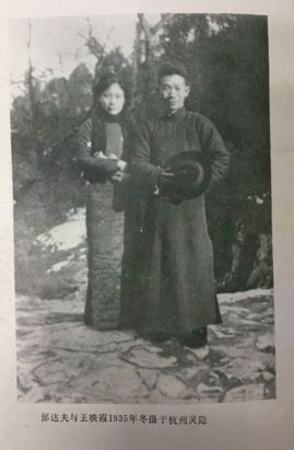 东京帝国大学求学时郁达夫之半身照 1935年冬,郁达夫和王映霞合影于杭州灵隐寺,为一全身照,背后山地的积雪宛然可见。夫妻俩均着棉布长袍,精神抖擞,均面带微笑。郁达夫手持一顶黑色毡帽,脚上穿一双黑直贡呢的圆口鞋子,而王映霞,脖子围着一块围巾,一端Q字形地垂在右肩前,双手交叉于胸前,眉目清晰,英气逼人。