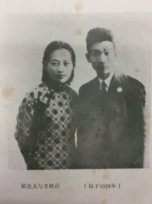 1938年,夫妻又有全身合影。王映霞眉目端正,穿一件格子旗袍,双手交错于背后,略显忧郁,双颊略微清减,和上幅照片之丰裕颇有差别;郁达夫神州深色西服,白衬衣,系深色 (也许朋友提到的暗红色)领带,胸口佩一徽章, 头部略倾向于王映霞,但两人身体并未交错。 生疏和分离似乎已在不言中。