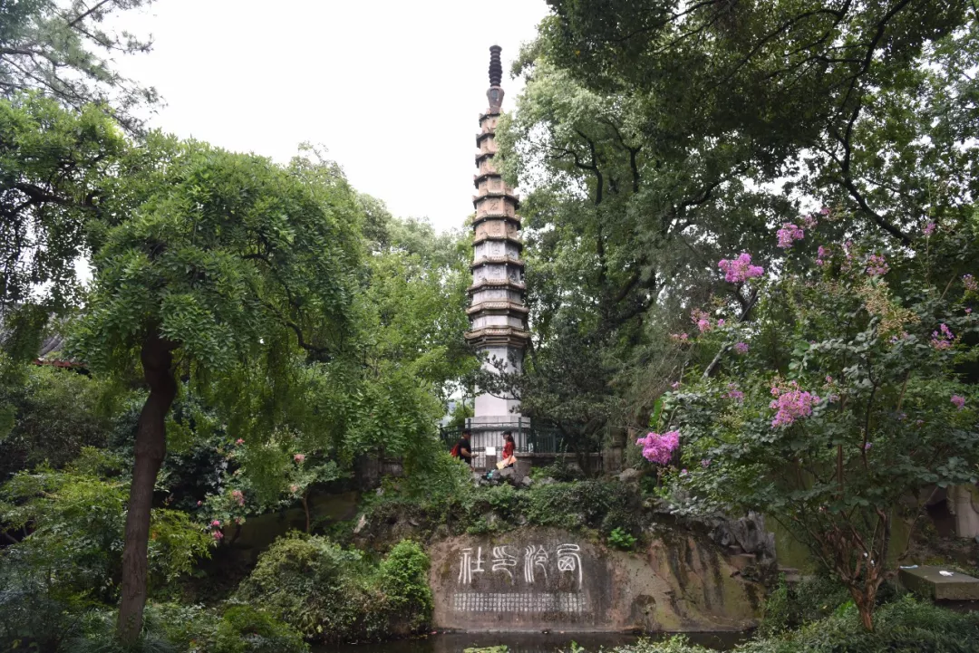(13)华严经塔 华严经塔位于山顶平面正中,是印社建筑制高点,为西泠印社的标志性建筑之一。此处原为古四照阁旧址,1924年西泠印社同人迁四照阁于凉堂之上,于是就在原址建了华严经塔。