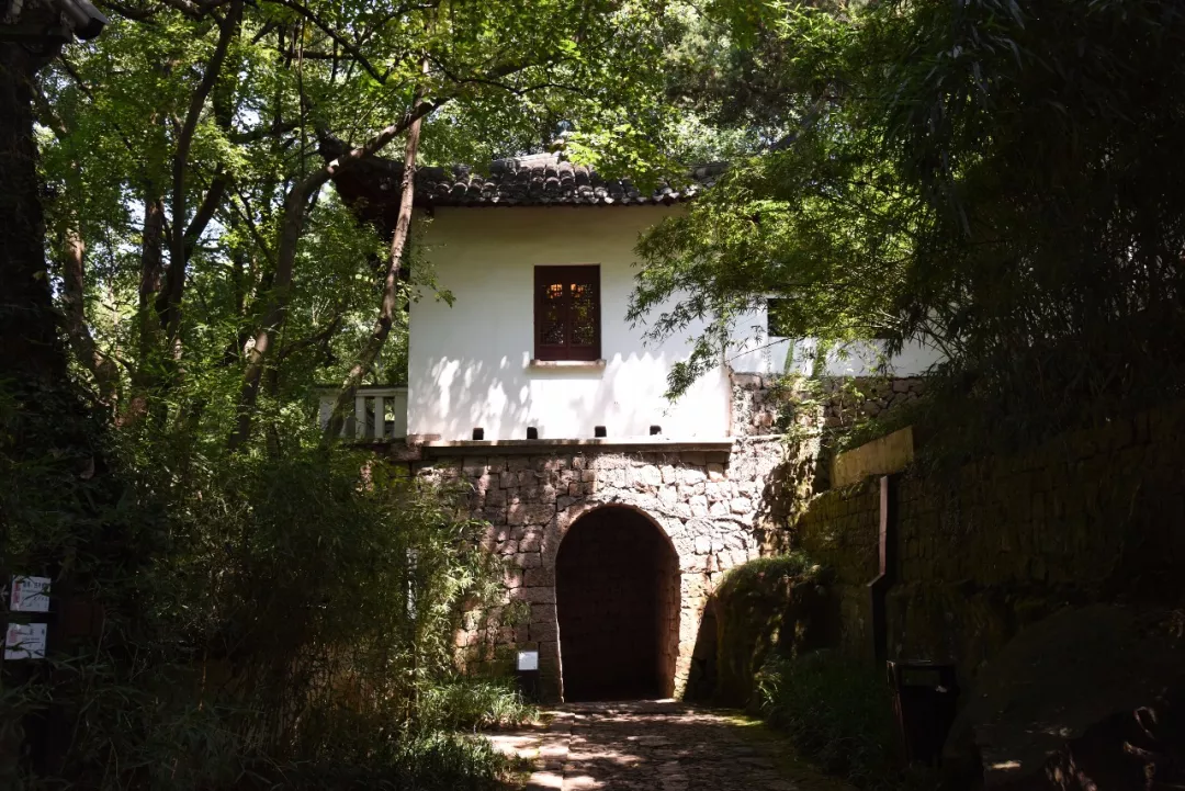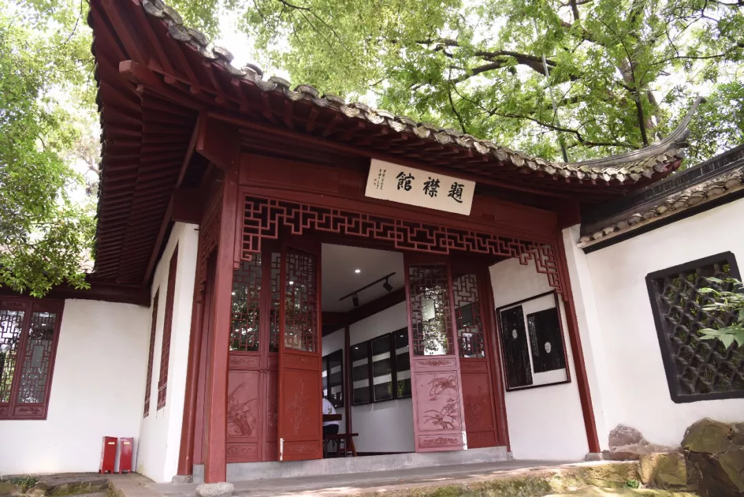 西泠印社依山筑屋,顶上岩石嶙峋,花木扶疏,馆阁错落。最高处有一楼,馆名“题襟”,馆外绿树三两株,环境十分清幽,正是当年海上题襟馆书画会会友相聚畅谈之所。楼后有另一建筑“鹤庐”,如果不是有此名称之分,外人一般是看不出来这是两处建筑。题襟馆和鹤庐有连廊相通。