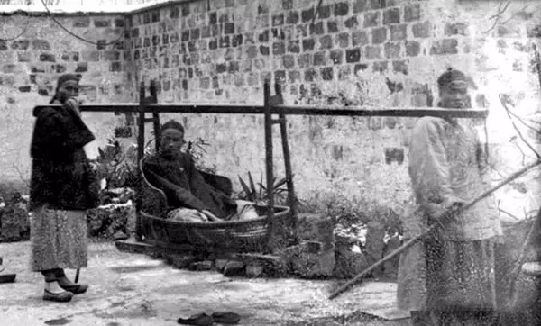 1897年,杭州,两个轿夫抬着一个大户人家的老爷。