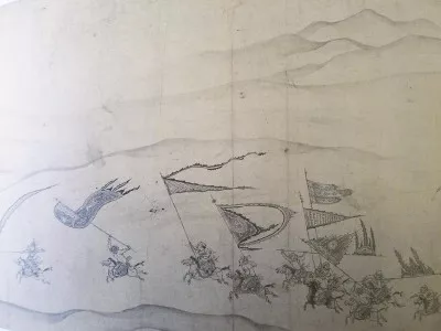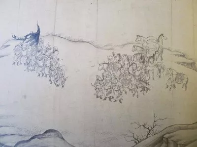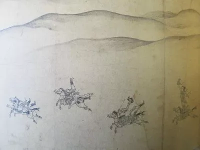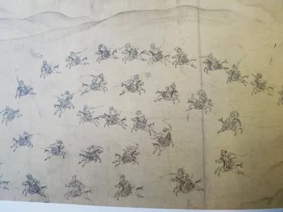 陈及之的长卷动用约三分之二篇幅,生动摹写胡人行军、骑射、马术、马球等骁勇善战、彪悍雄武的场面,突厥人皆和颜悦色,某些胡人表演马术的表情更是幽默诙谐。仅以三分之一篇幅描绘会盟场景,既不像赵孟頫说刘松年所画那样,“胡骑充斥,而俯伏道傍”,而仅有一人(或是颉利可汗)匍匐跪地,恭迎唐太宗;其他胡人流露的也全然不是刘松年笔下的“詟服听从之态”,脸上神情多是期待与新奇。至于坐在辇车中的唐太宗,也未见其色凛凛然,倒是颇安详平静的神态。