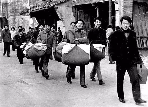 叶国兴/摄 1970年代,杭州近郊塘栖镇,一户家庭,提着用布包裹的棉被、衣服,浩浩荡荡送嫁妆。