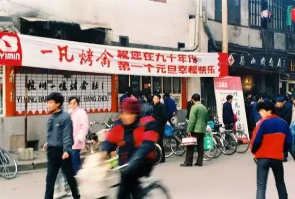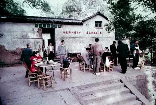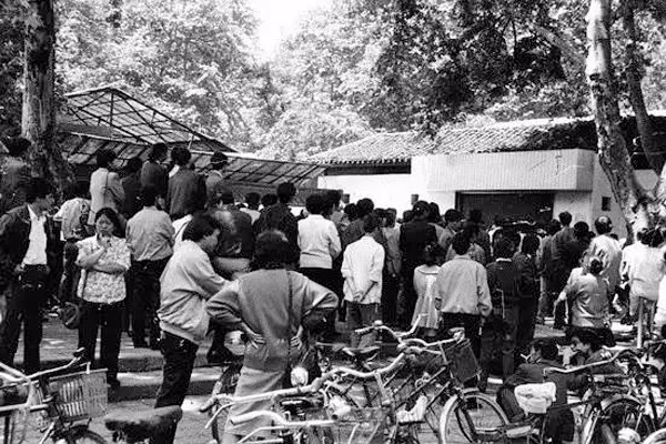 1993年8月,杭州柳浪闻莺公园钱王祠,股民在浙江证券交易所的露天屏幕前看交易。