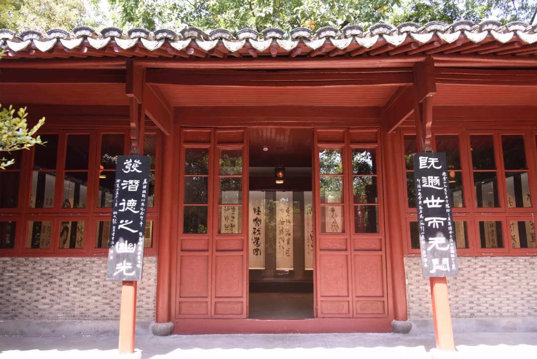 堂柱上有一隶书六言联,为张祖翼所撰写:“既遁世而无闷,发潜德之幽光。”正是承吴隐之意,言有才德的君子擅甘心退隐,就没有烦闷之虞,并且能继续发扬大德。门旁两侧有联,丁上左撰:“趣洽情自超,信知翰墨有真乐;造极境忽辟,漫从诗画记因缘。”