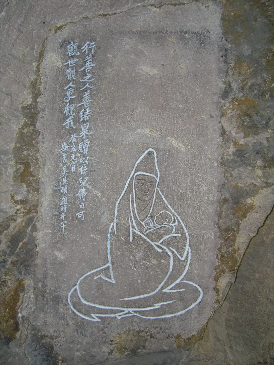 西侧墙面上有王一亭画、吴昌硕题的“送子观音像”阴刻,高126厘米,宽64厘米,观音趺坐,怀抱小儿,为王一亭1923年画。左上吴昌硕题句:“行善之人善结果,赠以佳儿佛曰可,观世观人更观我。”是王、吴二人画印唱和的最好见证。