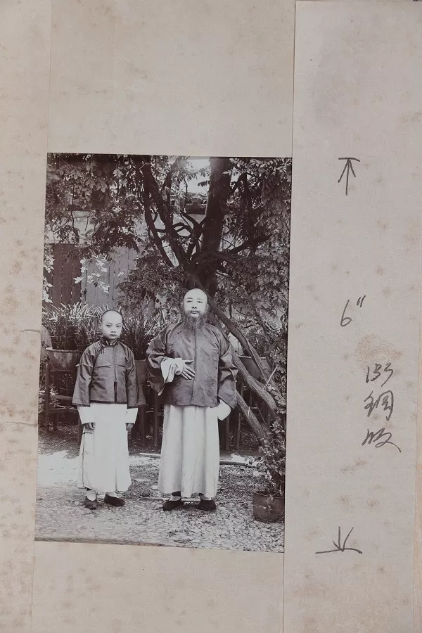 梁鼎芬五十二岁与其子梁思孝合影。1962年杨敬安编辑《节庵先生遗稿》,首次刊发此照,此为照片刊发时的编辑样。