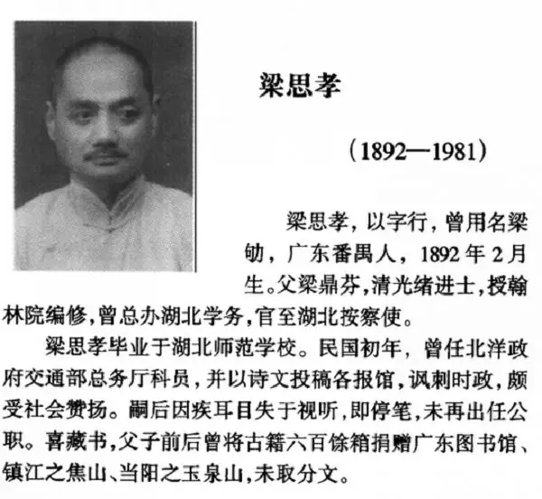 梁思孝的传记,据《中央文史研究馆馆员传略》(中央文史研究馆编,中华书局2001年版,页104) 藏这张拓片的杨敬安,系梁鼎芬在两湖书院时的学生,杨读的是方言学堂,学的法语。宣统元年(己酉,1909)卒业,他受当时广东大学堂监督吴道镕太史之聘,教授法语。到1918年六月初六是梁鼎芬的六十大寿,友人纷纷为之撰联为寿,后来杨敬安编辑《节庵先生賸稿》,附录一卷便是《六十寿联一百一十六对》,收录了吴道镕写的寿联:“前生仿佛归猿洞,雅事传闻见鹿亭。”按,梁鼎芬之父曾在广东乐昌县任职,梁鼎芬随在任所,一日父亲带他到峡山寺谒佛,“入门,忽失所在,遍觅之,乃得之于涧边,虽曲径重闼如夙经。其后先生语人,谓己身为峡山老猿托生……”(吴谱系于同治元年,时梁鼎芬四岁)这是寿联上联的故事,下联则是在玉泉山见鹿一事。对梁鼎芬这位百多年前的“行为艺术家”而言,他一生中的这两起“灵异事件”,想必喧传于世,流传甚广,吴道镕的寿联,自有舆论基础的。
