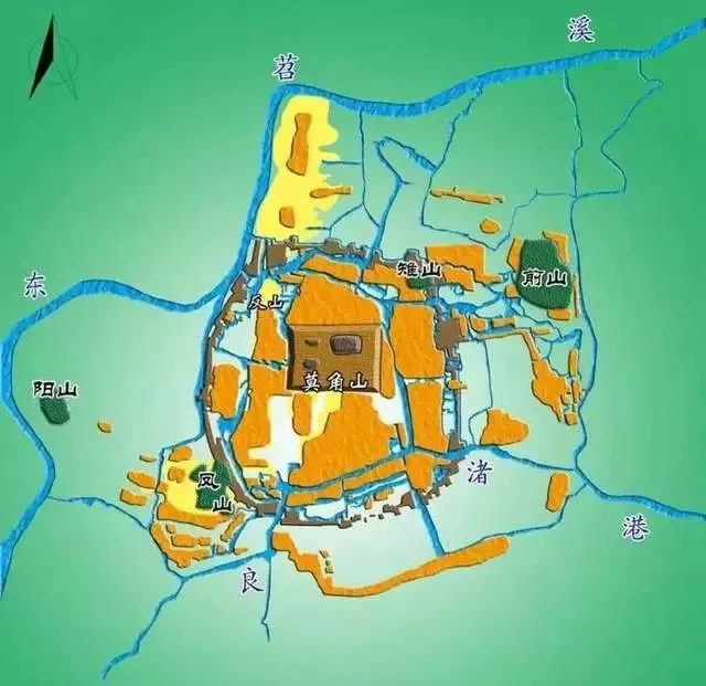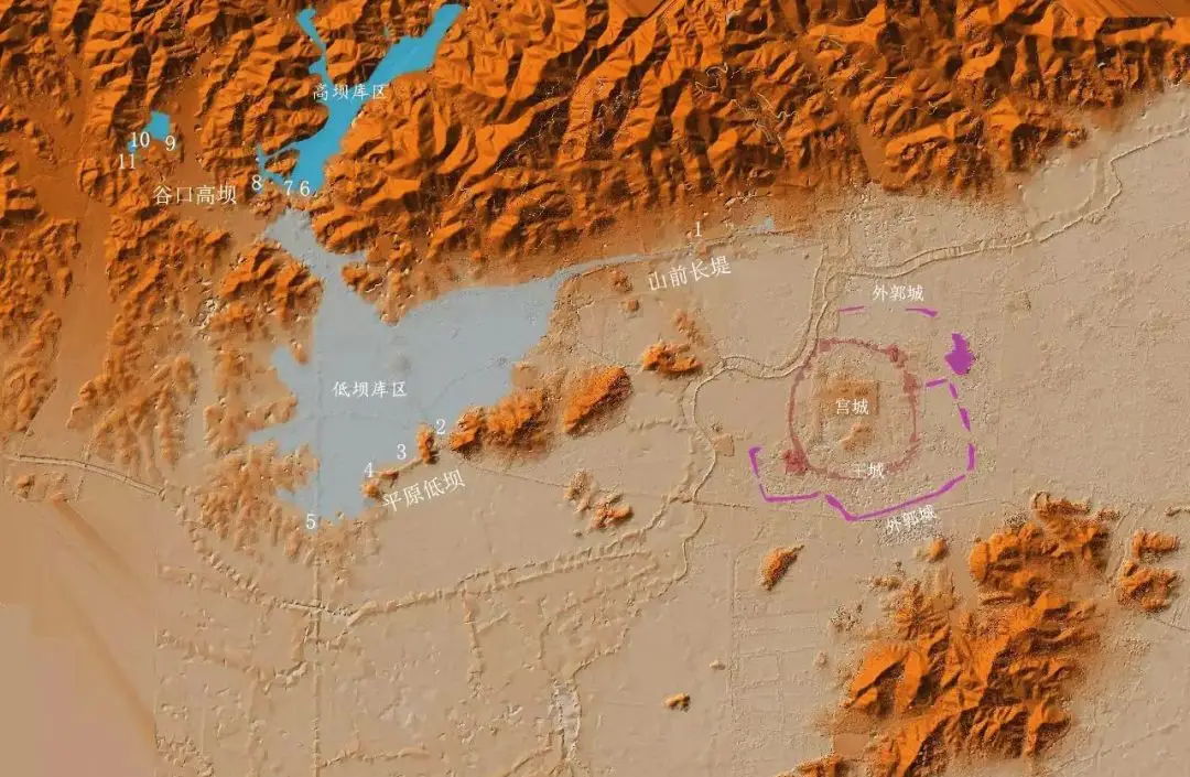 良渚古城及外围水利系统结构地形图。考古学家在良渚古城勘探时发现,当时城内有“工”字形的水系与城外的水网连通。该城为目前所发现的同时期中国最大的城址遗迹,可谓“中华第一城”