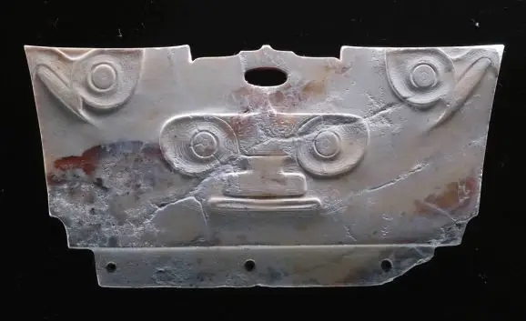 良渚文化冠形器(亦称玉梳背),高4.2厘米,宽3.85厘米,出土于浙江杭州反山。该器为片状梯形,中部有大眼阔鼻浮雕兽面纹,嘴扁而宽,眼廓、鼻、嘴皆饰细阴线纹,样式精美
