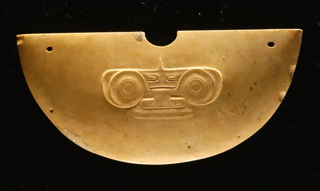 良渚文化的玉璜,出土于浙江杭州瓶窑。上面的图案以往被解读为兽面(或饕餮),但现在专家多认为其是良渚人崇拜的神徽。良渚文化出土的许多玉器上雕刻有该神徽,而且构形也与表现该神徽有着直接的关系,反映了良渚文化以神权为纽带的统治模式