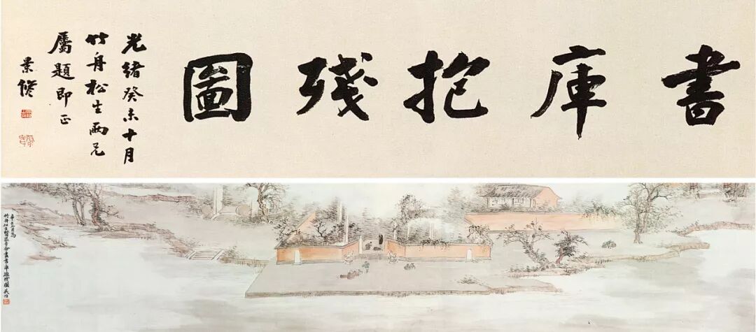 《书库抱残图》第一图作于同治三年(1864)六月文澜阁遗书暂贮杭州府学尊经阁之后,因当年年文澜阁主事者陆光祺尚在上海,丁丙请其回杭整理书籍,并请绘图以纪事,左宗棠名之曰《书库抱残图》,莫友芝作篆书“书库抱残图”五字题其端。