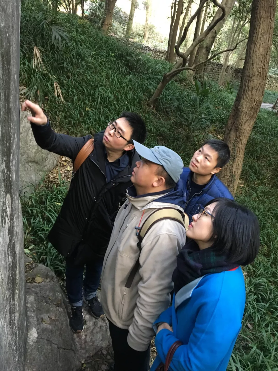 其实,喜欢在西湖群山寻找摩崖碑刻的人自古就有很多,清代尤盛,阮元有《两浙金石志》流传于世,《武林金石记》也传为丁敬所撰。丁筱的朋友、故宫博物院书画部副研究馆员秦明,一直对清代金石考古家、“西泠八家”之一的黄易重要的山水作品之一《访古纪游图册》题跋中屡屡提及的“辛卯”纪年总有疑虑,于是在2017年12月专程来杭进行“黄易江浙访古纪游专题考察”。 当时,秦明丁筱一行人对飞来峰等地的摩崖石刻题名进行搜索排查,并在水乐洞着重探察所谓的“张燕昌等人题名”。该题名有人曾拓得如下文字:“□□海盐张燕昌山阴陈广宁金匮钱泳嘉兴戴经戴光曾江宁刘徵长洲吴国宝以乾隆六十年十月十日来此。”天色渐晚,借助手电,秦明发现了首行“海”字上的“易”字,紧接着有人辨识出其上的“黄”字,丁筱又在“黄易”之“易”字右侧又发现了一个“易”字,原来是“锡”字的右半,秦瀛的籍贯正是“无锡”,最终辨识认定,前面漏掉的一行字是“无锡秦瀛钱唐”六字,这才是该题名真正的第一行字。水乐洞秦瀛黄易等题名,凡7 行50 字,其内容与《水乐洞》一图中黄易题跋完全吻合。这样一来,就完整发现了水乐洞黄易等题名,从而证明了彼时黄易返杭丁内忧期间,在杭州确实有过多次访古之行。