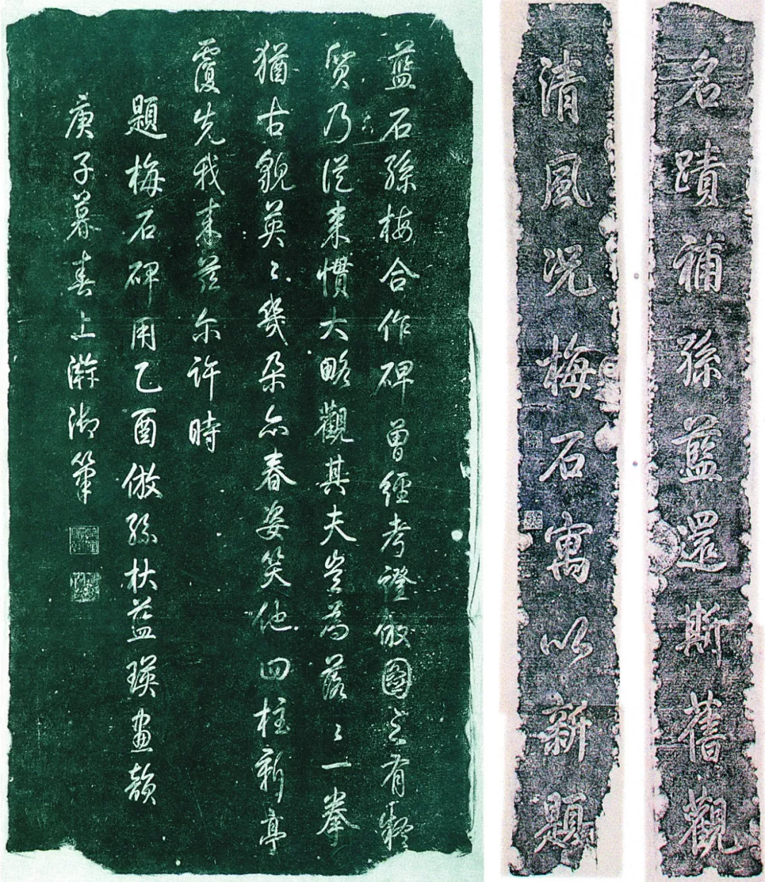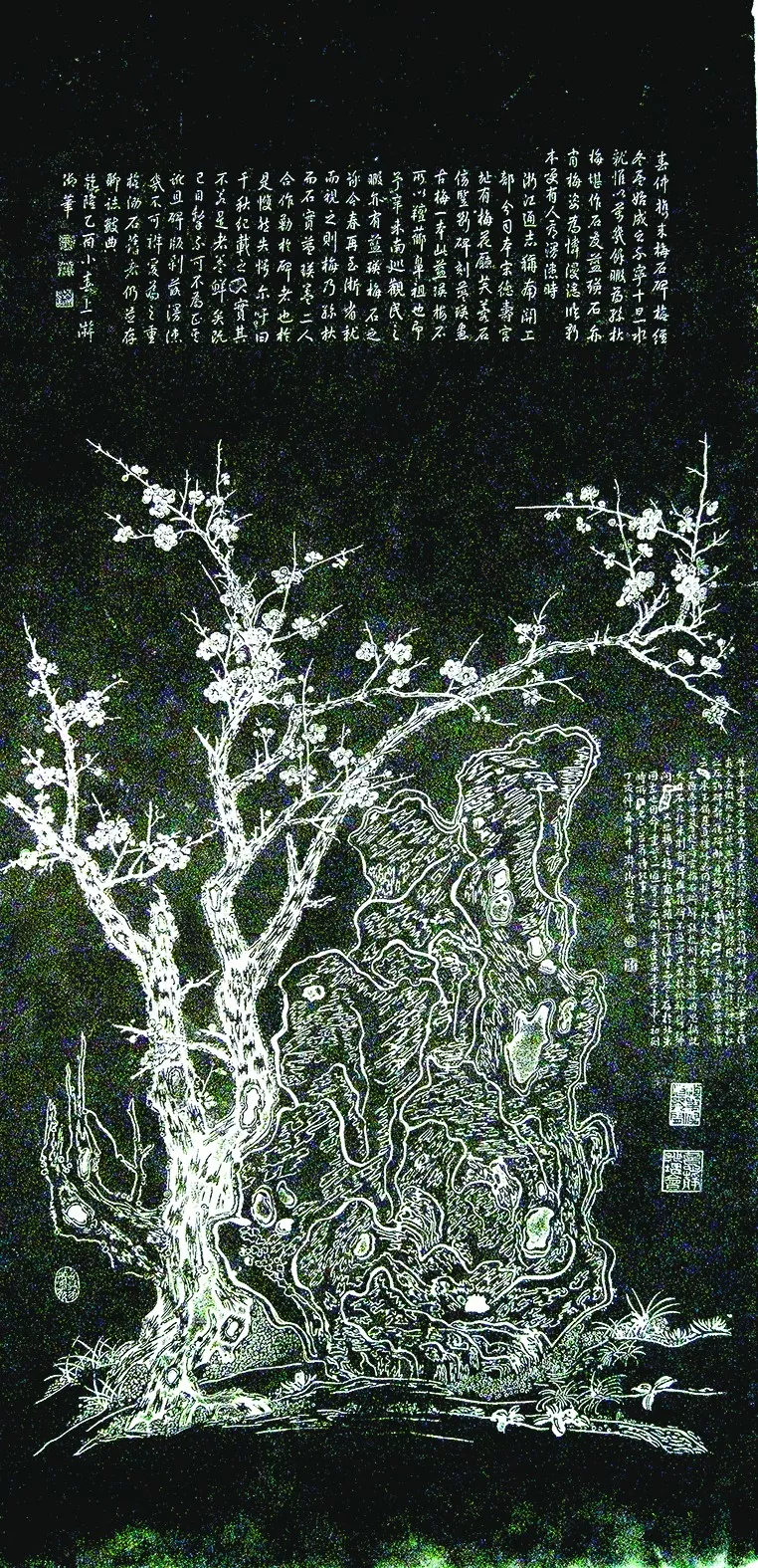 乾隆皇帝热衷书画,南巡杭州后见碑石斑驳破损,便想重刻梅石碑。“其实,乾隆帝在北京先后做了两件梅石碑,留有一块放于圆明园芙蓉石旁,称为北京碑,一块送回杭州。”陈进说。 最早立于德寿宫的梅石碑,在清代乾隆年间已“碑断为三片,委弃蔓草间”,至今不知所终。但关于它的故事,多有流传。《西湖民间传说》载,梅石碑上的梅花会开会谢,石碑还能预报天气,人们从石碑上的湿度变化可以知道时令节气,天晴落雨。此一民间传说赋予石碑鲜活的灵性,演绎了一段传奇。 而重刻的北京碑也很传奇,圆明园虽惨遭英法联军的火烧与洗劫,但此碑竟然劫后余生,后又经过数次迁徙,最终安然无恙地落户于北京大学校园内,成为今天该校的名迹胜景。 至于与杭州地名相生相依的梅石碑,自它从京来杭的那时起,一直以来是当地历史与文化的重要标志,然而从上世纪六十年代中期后,它就销声匿迹了。“2008 年9月,跟随着杭州孔庙完成复建工程并对外正式开放,这块珍藏于杭州碑林的梅石碑,终于掸去尘埃,重新亮相。碑作四面刻,碑阳刻孙杕和蓝瑛合作之梅石图一幅,配以乾隆御题梅石图诗一首。” 经陈进考证,乾隆皇帝不仅将梅石碑拓本带回北京,而且亲自费时数月摹绘梅石图,又交内府刻成石碑送至杭州,并与旧碑放置在一起。更为称奇的是,在杭州碑刻成后乾隆又命再刻北京碑,不仅如此,乾隆还因梅石碑,先后作诗六首,作跋两篇,作联一对,充分显示了乾隆对梅石碑的极大兴趣与投入,这对杭州来说是一项流芳百世的善举。
