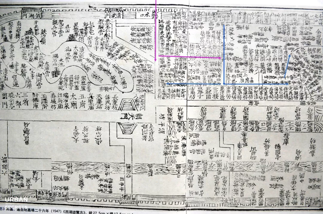 ▲南宋时期,红线即为流福沟水流方向,在蓝线处流入涌金门西来的流水(地图方向:上西下东)