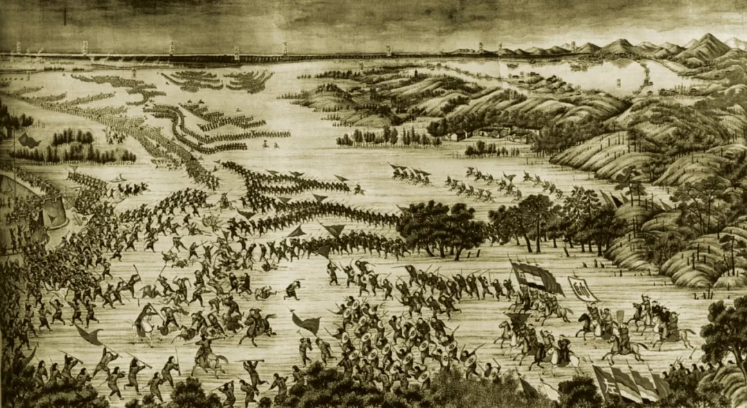 ▲《清兵攻占杭州图》。咸丰十年(1860)至同治三年(1864)清兵与天平军在杭州曾数度激战。图绘同治三年(1864)左宗棠率部攻杭州城,右上角为西湖。
