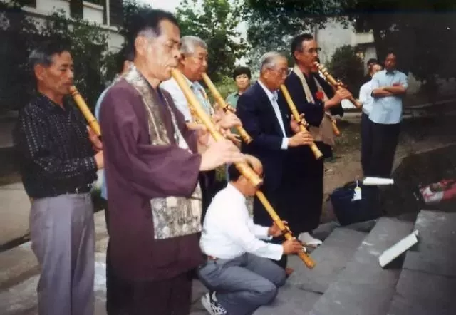 心地觉心返回日本后,把尺八也带了回去,并在日本和歌山县创建了兴国寺,尺八成了佛门法器,代代相传,又因《虚铎》这曲子源于中国高僧普化禅师的振铎狂歌,所以心地觉心一脉在日本的延续,又叫“普化宗”。 750年的历史中,兴国寺的僧人从江户时代,一批又一批到杭州护国仁王寺朝拜,如今,日本的兴国寺仍在,杭州这座护国寺却难觅踪迹。 1997年,日本兴国寺,住持方丈山川宗玄发现心地觉心木雕坐像上有一些小的裂缝,寺院立即请来文物保护专家进行检修,在坐像的肚膛内意外地发现了多部心地觉心从中国带过去的佛经。 山川宗玄大为震惊之余,从此,到杭州护国寺朝拜还愿的想法,成为他的头等心愿。但是,他多次打听都不知道护国寺在杭州的那个确切位置,后来还是有“中国尺八第一人”之称的孙以诚的一篇《日本尺八与杭州护国仁王禅寺》论文,引起了日本东洋大学的小岛岱山博士的注意,把护国仁王寺存在的这个消息带给山川,山川当时特别的激动与高兴。 ▲陶俑文物中的尺八吹奏(左) 1999年11月26日,山川宗玄率领48位普化宗僧人和尺八演奏家,来到杭州寻根认祖。他们在护国仁王禅寺门口,一下汽车,便排起长队,戴天盖、着袈裟、挂布袋,吹奏着尺八,朝着护国寺旧址,缓缓而入。