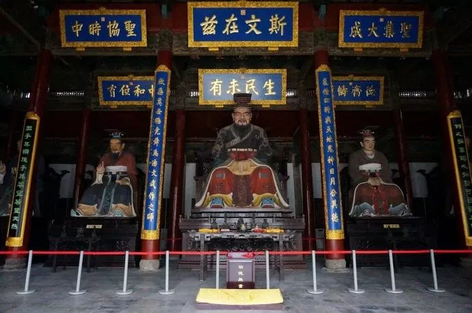 大成殿是祭孔子主殿,殿内正中有孔子全身雕像,曾参、孟子、颜渊、孔伋分列四周。孔子雕像上方有三块匾“生民未有”令人瞩目。