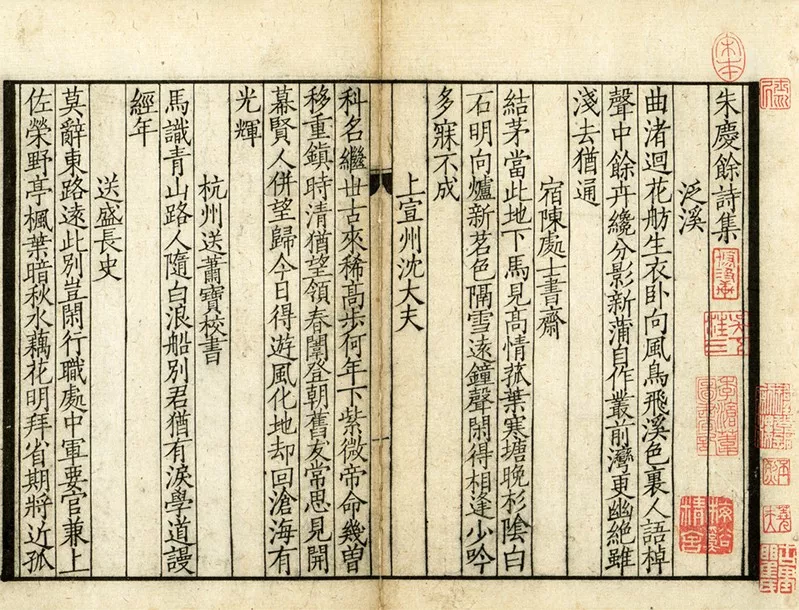 ▲ 南宋临安睦亲坊(今杭州众安桥附近)陈起书籍铺刻印的《朱庆馀诗集》。国家图书馆藏