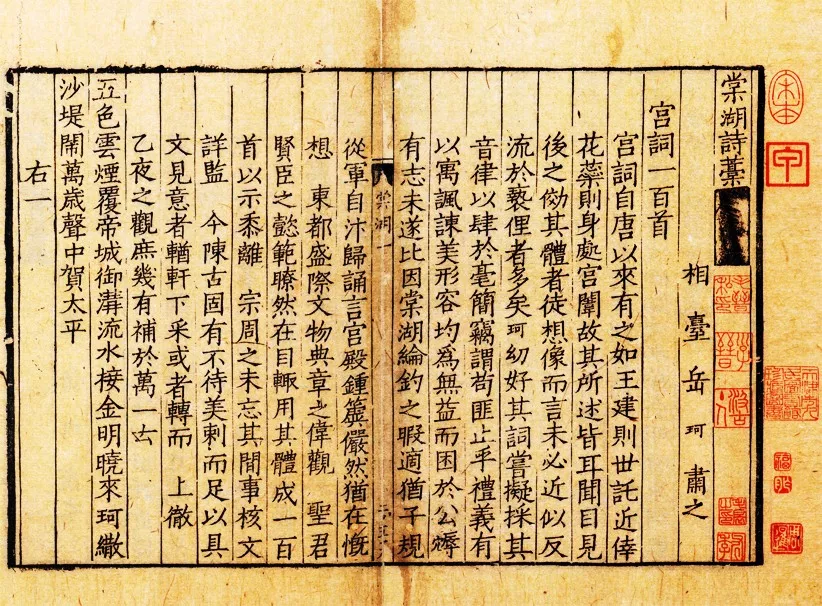 ▲ 南宋临安府棚北大街(今杭州众安桥附近)陈起书籍铺刻印的岳珂(岳飞孙子)《棠湖诗稿》是天津图书馆的珍藏