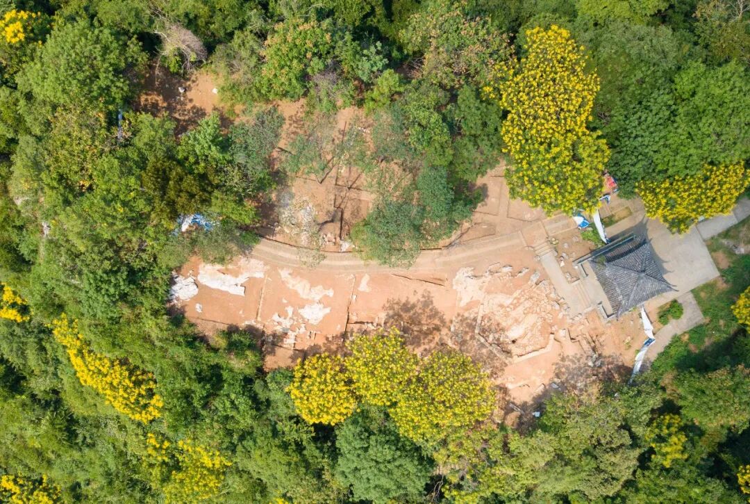 西湖十景中的“双峰插云”,乃南高峰与北高峰之上,双塔对峙,高出云表,时露双尖,望之如插。然而,塔已不在,如何插得? 考古发掘工作为我们揭开了南高峰塔的面纱。2017年1月至6月,为配合景观整治提升改造工程,杭州市文物考古研究所对南高峰塔遗址进行了考古发掘。共发掘面积约1100平方米,发现遗迹有南高峰塔塔基、道路、塔院(荣国寺)建筑基址等。塔基利用自然山岩,经过平整、填筑而成,平面呈六角形,对径长约10.1米,单边长约5.07米,宽约0.4米,现仅存西、南两面三道边的底层石条,余皆被毁无存。此外,还出土少量瓦当、滴水、塔砖等建筑构件。根据出土遗迹、遗物的特征,确认了南高峰塔的准确位置以及宋代南高峰塔前塔后院的整体空间格局。