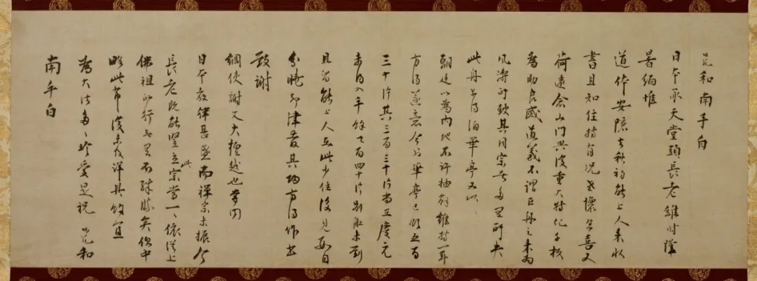 上图:镜堂觉圆笔 日本九州博物馆藏 2、雪岩祖钦及其法脉传承 雪岩祖钦(1214-1287),婺州(浙江金华)人,无准师范法嗣。历主潭州龙兴、湘西道林、处州佛日、台州护圣、湖州光孝等寺。咸淳五年(1269)主仰山,受元世祖优礼。祖钦法脉中,有四人在日本开宗立派,分别是灵山道隐、别传妙胤、古先印元、大拙祖能。 灵山道隐(1255-1325),嗣法雪岩祖钦。延佑六年(1319),应幕府执权北条高时邀请赴日,先后出任镰仓建长寺、圆觉寺住持,谥号佛慧禅师。着有《业识团》。道隐在日本开创的派别称作灵山派,下传4代,弟子法孙中,留名者凡10人。道隐与师范法脉关系如下:无准师范→雪岩祖钦→灵山道隐。 别传妙胤(?-1348),一说日本人,一说中国人。嗣法径山寺虚谷希陵(1247-1322)。希陵乃雪岩祖钦的嗣法弟子,延佑三年(1316)住持径山寺,至治二年(1322)示寂。妙胤于日本正平元年(1347)担任京都建仁寺住持,翌年示寂。妙胤开创的派别称作别传派,嗣法弟子2人,仅传一代。妙胤与师范法脉关系如下:无准师范→雪岩祖钦→虚谷希陵→别传妙胤。 古先印元(1295-1374),萨摩(今鹿儿岛县)人,俗姓藤原氏。初从镰仓圆觉寺桃溪德悟出家,延佑五年(1318)来元,嗣法杭州天目山中峰明本。嘉历元年(1326)与赴日元僧清拙正澄同船归国。受梦窗疏石之请,先后出任甲斐(今山梨县)恵林寺、山城(今京都)三条坊门等持寺、镰仓净智寺、圆觉寺、建长寺等寺住持。其间,于奥羽(今福岛县)须贺川创建普应寺。谥号正宗广智禅师。印元在日本开创的派别称作古先派,下传5代,弟子法孙中,留名者凡22人。印元与师范法脉关系如下:无准师范→雪岩祖钦→高峰原妙→中峰明本→古先印元。 大拙祖能(1313-1377),镰仓(在今神奈川县)人,至正三年(1343)入元,在千岩元长(1284-1357)门下受印可,至正十八年归国。历任肥后(熊本县)永德寺、筑前(福冈县)显孝寺、丰后(大分县)万寿寺、上野(群马县)吉祥寺等寺住持,后开创上野宝林寺,住持镰仓圆觉寺、建长寺,受到幕府将军足利义满、后圆融天皇等人的皈依。谥号广圆明鉴禅师。祖能在日本开创的派别称作大拙派,下传16代,弟子法孙中,留名者凡47人。祖能与师范法脉关系如下:无准师范→雪岩祖钦→高峰原妙→中峰明本→千岩元长→大拙祖能。 雪岩祖钦法脉中,以未曾赴日的中峰明本在日本影响最大。 中峰明本(1263-1323),俗姓孙,自称“幻住道人”。杭州人,高峰原妙(1238-1296)法嗣。长期隐居湖州弁山之幻住庵,延佑五年(1318),住杭州天目山师子院。从元仁宗处获赐“法慧禅师”、“佛慈圆照广慧禅师”号。至治三年(1323)八月示寂,谥号“智觉禅师”、“普应国师”。著有《天目中峰和尚广录》三十卷、《天目明本禅师杂录》一卷、《幻住庵清规》一卷、《梅花百咏》一卷等。中峰以深厚的佛法修证、高洁的道德情操受到帝王士大夫的尊崇,被誉为“江南古佛”,声名响彻海内外,是元代来华日僧主要参访对象。仅知姓名者,就有21位日僧曾随他参禅,并有远溪祖雄、复庵宗己、无隐元晦、业海本净、古先印元、明叟齐哲、义南菩萨等7人成为其嗣法弟子。其中,丹波高源寺(在今兵库县)开山远溪祖雄(1286-1344)法脉虽未入24 流,却人才辈出,在室町时代末期得到了飞速的发展,从安土桃山时代到江户时代末期,逐渐进入京都及镰仓五山禅寺,成为幻住派中最有影响力的一支。