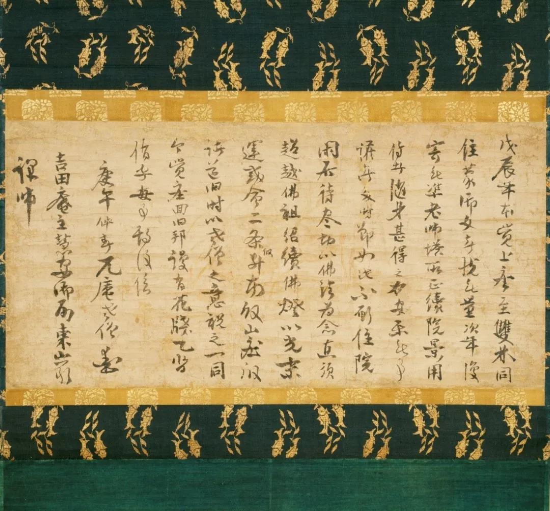 上图:兀庵普宁墨迹(与东岩慧安尺牍) 奈良博物馆藏 3、无学祖元及其法脉传承 无学祖元(1226-1286),庆元府鄞县(今浙江省宁波市鄞州区)人。17岁在无准师范会下参禅,直到淳祐九年(1249)后者圆寂。至元十六年(1279),应幕府执权北条时宗(1251-1284)之请赴日。初住镰仓建长寺,后应请为镰仓圆觉寺开山。日本弘安九年(1286)示寂,谥号“佛光国师”、“圆满常照国师”,有《佛光国师语录》十卷存世。在日七年间,祖元一心弘法,大扬临济禅风,受到日本朝野僧俗的一致崇敬,也是日本五山文学的主要奠基者之一。 无学祖元开创的禅宗流派称“佛光派”,嗣法弟子有规庵祖圆、高峰显日、一翁院豪、云屋慧轮等30余名。元代赴日禅僧清拙正澄(1274-1339)曾说佛光派”诸孙中多麟角凤毛,源远流长,本深叶茂” 。据《五山禅林宗派图》,规庵祖圆(1261-1313)下传9代,弟子法孙中留名者凡56人。在后世影响最大者,乃高峰显日(1241-1316)弟子梦窗疏石开创的梦窗派,下有门派16支,历20代,弟子留名者凡1729人。梦窗疏石(1275-1351),伊势(今三重县)人,京都天龙寺开山,深受后醍醐天皇和室町幕府首代将军足利尊氏的尊崇,生前与灭后先后得到七位天皇赐予的国师号,被称作”七朝帝师”。整个室町时代,其门徒皆受足利氏归依和庇护,在禅林占有绝对优势地位。玉村竹二指出,在江户时代以前,梦窗疏石法脉弟子数超过圣一派,只因该派势力在江户时代急剧衰退,法脉相关记录保存不善,弟子中留名者不多。 上图:无学祖元墨迹(重阳上堂偈) 常盘山文库藏 (二)无准师范法孙及其在日本的法脉传承 日本禅宗24流派中,有5支是由无准师范的法孙们创立,其中4支出自师范弟子雪岩祖钦的法脉。 1、镜堂觉圆及其法脉传承 镜堂觉圆(1244-1306),四川人,嗣法环溪惟一(1202-1281)。淳祐六年(1246)出主浙江瑞岩寺。至元十六年(1279)春,与无学祖元相伴赴日。抵日后,受北条时宗尊崇,先后住持镰仓长胜寺、禅兴寺、法智寺、圆觉寺、建长寺等寺,自日本正安二年(1300)起,担任京都建仁寺住持,直到嘉元四年(1306)九月示寂。谥号“大圆禅师”。有《镜堂和尚语录》三卷存世。觉圆开创的门派称“镜堂派”,下传6代,弟子法孙中,留名者凡15人。觉圆与师范法脉关系如下:无准师范→环溪惟一→镜堂觉圆。