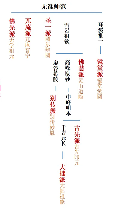 无准师范像 无准师范(1177-1249),梓潼(今四川省绵阳市梓潼县)人,俗姓雍,别称圆照、乌头子。九岁出家,十七岁受戒后出蜀,游历江南,先后参谒了多位著名禅师,最后嗣法破庵祖先(1136-1211)。历住明州清凉寺(在今浙江宁波)、镇江府焦山普济寺(在今江苏镇江)、庆元府雪窦寺(在今浙江奉化)、明州阿育王寺(在今浙江宁波)等,绍定五年(1232),奉宋理宗之命主持径山兴圣万寿禅寺(在今浙江杭州)。始建于唐天宝元年(742)的径山寺,在大慧宗杲(1089-1163)担任持时迎来新的发展时期,道法隆盛,信众日增。南宋宁宗嘉定年间(1208-1224),朝廷规定天下诸寺寺格等级,最具名望的禅宗五大寺和其次的十座大寺被认定为“五山十刹”,径山寺位列五山之首。无准住持径山寺十七年期间,多次应召入宫,为宋理宗及皇太后说法,获赐“佛鉴禅师”号及金襕袈裟。淳祐九年(1249)三月圆寂。有《无准师范禅师语录》五卷、《无准和尚奏对语录》一卷存世。 作为一代名僧,关于他的研究自然不少,内容涵盖其传记资料、生平事迹、禅学思想、海外影响等多个方面。就其海外影响而言,目前的研究多集中在探讨他与日本弟子的交往过程及其著名弟子的事迹与影响上,至于他在日本禅宗史上的地位,虽有诸如“对日本临济宗影响很大” “是日本禅宗史上不可忘却的人物” “对于日本禅宗的兴盛贡献卓著” 等基本认识,却缺乏细致考察和综合分析。有鉴于此,本文拟通过对其日本法脉传承的考察,通过对五山诗文中相关记载的解读,探讨他在日本禅宗史上的地位及影响。 一、无准师范法脉在日本的传承与发展:枝繁叶茂、延绵不绝 日本中世名僧中岩圆月(1300-1375)曾说:“龙渊分余波于海东,圆照子孙擅众多之美。” 龙渊指径山寺,圆照则为无准师范,从此句可以看出,当时的日本禅林俊杰中,多无准师范的法孙。义堂周信(1325-1388)则言:“圆照一派入于东海,而大者六,曰佛光氏、曰圣一氏、曰雪岩氏、曰环溪氏、曰兀庵氏、曰别山氏。是六者,子孙粲尔,星布乎天下。” 进一步指出无准师范弟子中在日本影响最大的六位,他们法孙遍布禅林,且中多优秀之才。事实上,在日本早期形成的二十四支禅宗流派中,有八支来自这六人或其弟子法孙开创的流派。 据日本延宝五年(1677)释半人子所撰《二十四流宗源图记》,从日本建久二年(1191)荣西将禅宗传至日本到观应二年(1351)元僧东陵永玙赴日,一百六十年间,日本形成的禅宗流派共有二十四支,这一说法已得到学界普遍的认同。无准法脉开创的八支分别是:圆尔开创的圣一派、兀庵普宁开创的兀庵派(又称宗觉派)、无学祖元开创的佛光派、镜堂觉圆开创的镜堂派、灵山道隐开创的佛慧派(又称灵山派)、别传妙胤开创的别传派、古先印元开创的古先派、大拙祖能开创的大拙派。无准师范与各派派祖的关系详见下图: