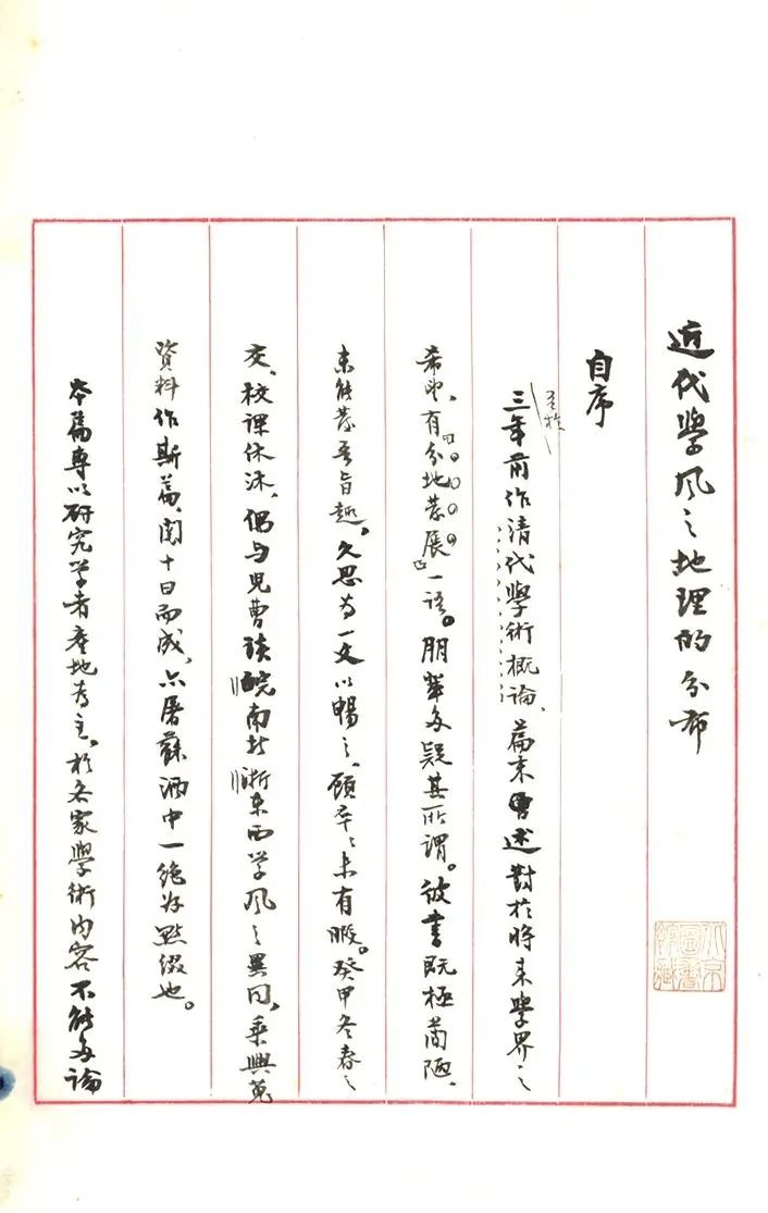 《近代学风之地理的分布》(稿本) 与此前后,任公或演讲或刊发了《清初五大师学术梗概》、《明清之交中国思想界及其代表人物》、《近代学风之地理的分布》、《清代政治与学术之交互的影响》等文章。如《近代学风之地理的分布·自序》有曰: 吾于三年前作《清代学术概论》,篇末述对于将来学界之希望,有“分地发展”一语,朋辈多疑其所谓。彼书既极简陋,未能发吾旨趣,久思为一文以畅之,顾卒卒未有暇。癸甲冬春之交,校课休沐,偶与儿曹谈皖南北、浙东西学风之异同,乘兴搜资料作斯篇,阅十日而成,亦屠苏酒中一绝好点缀也。 本篇专以研究学者产地为主,于各家学术内容不能多论列,文体宜尔也。欲知其概,则有拙著《近三百年学术史》在。 另外,一九二三年十二月一日《晨报五周年纪念增刊》向任公征文,任公以《中国近三百年学术史》第二、三、四讲即《清代学术变迁与政治的影响》塞责,但是又为题识曰: 本文为今秋在清华学校所讲《中国近三百年学术史》之第二章。《晨报纪念号》征文,因校课罕暇,辄录副塞责。但近顷在师范大学国文学会续讲此题,颇有所增订,未及校改。或将来该会有笔记,可资参考也。 任公在北京师范大学国文学会讲演共四次,演讲时必有所据,——所据者,讲稿也。——即《中国近三百年学术史》讲义排印本。所谓“颇有所增订”者,盖即演讲中临时之发挥也。后经汪震、姜师肱、李宏毅、董淮笔记,题《清代政治与学术之交互的影响》,连载于《北京师大周刊》(一九二三年十一月十八日、十二月九日、十二月十六日及一九二四年一月十三日四期)。后又作为王桐龄《中国史》第四编之代序,冠于该书卷首,文末且有王氏《题识》曰: 右系民国十二年十一月梁任公先生在北京师范大学公开讲演之短篇论文,原题为“清代学术与政治之交互的影响”,以其文简单明了,可以通观清代大势,刊之卷首以代序文。 任公此文简洁畅达,将清代政治与学术之关系,讲得透彻,说得明白,且融个人情感于其中,颇能动人。 我们若将《清代学术概论》、《中国近三百年学术概略》、《中国近三百年学术史》与这五篇文章,汇齐并观,可见前三者是一脉相承的;而所附的五篇文章,则又是与之互为补充与发明者也。 前“近因与远因”一节言及任公一九一八年家居,为儿辈讲“学术流别”之“备忘录”,梁启勋谓“实《清代学术概论》之胚胎”,良有以也。兹亦将此备忘录拟题作“清代学术流别纲目”,一并附后云尔。 四、版本与校本《共学社史学丛书》本《清代学术概论》,自一九二一年二月由商务印书馆印行第一版之后,畅销海内外。一九三〇年三月印至第八版;同年四月,改版纳入《万有文库》(内封页又冠《国学基本丛书》名),称第一版。一九三四年九月,以原《共学社史学丛书》本改列《大学丛书》,称第一版;至一九四〇年十月第四版。一九四四年七月,商务印书馆重庆重排《大学丛书》本,称渝第一版;一九四五年四月,渝第三版。一九四七年二月又以原《共学社史学丛书》本改列《新中学文库》本第五版。仅就此为止,商务印书馆分别将该书纳入《共学社史学丛书》、《万有文库》、《国学基本丛书》、《大学丛书》(沪版、渝版)、《新中学文库》等丛书,至少印行了二十一版。