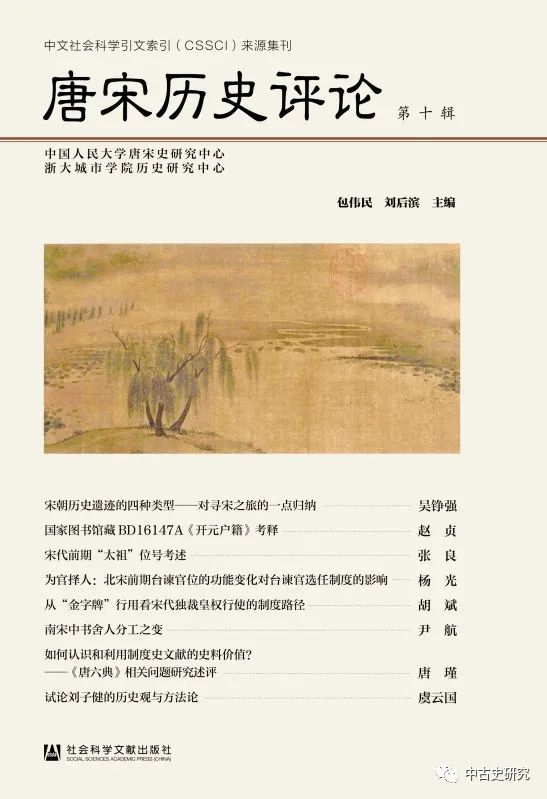 ·笔谈:唐宋的田野· 宋朝历史遗迹的四种类型——对寻宋之旅的一点归纳 吴铮强 宋人对兴化军山区的开发与认知初探——基于传世文献与田野材料互证的考察 杨信良 ·专论· 国家图书馆藏BD16147A《开元户籍》考释 赵贞 陈果仁信仰与隋至唐前期的常州地域社会——以碑刻史料为中心 关健赟 宋代前期“太祖”位号考述 张良 为官择人:北宋前期台谏官位的功能变化对台谏官选任制度的影响 杨光 从“金字牌”行用看宋代独裁皇权行使的制度路径 胡斌 ·札记· 唐代“集贤待制”考辨 雒晓辉 《宛委别藏》本《皇宋通鉴长编纪事本末》底本探源 李灵均 司马光《百官公卿表》研究 郭洋辰 南宋中书舍人分工之变 尹航 ·述论· 如何认识和利用制度史文献的史料价值?——《唐六典》相关问题研究述评 唐瑾 试论刘子健的历史观与方法论 虞云国