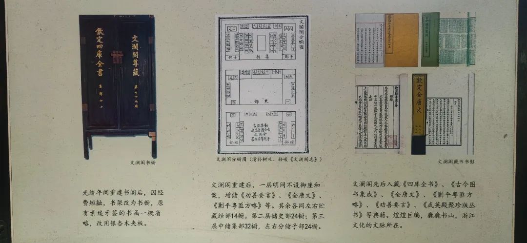 ▲文渊阁书橱实拍 清亡之后,民国建元(1912),文澜阁所藏《四库全书》归浙江图书馆接受并移藏浙江图书馆。从此文澜阁与《四库全书》分离。民国十八年(1929),西湖博览会举办,文澜阁被作为农业馆使用。浙江省西湖博物馆成立,文澜阁借作西湖博物馆历史文化部之用。1953年,省立西湖博物馆更名为浙江博物馆(1971年更名为浙江省博物馆),至今作为浙江省博物馆的一部分。