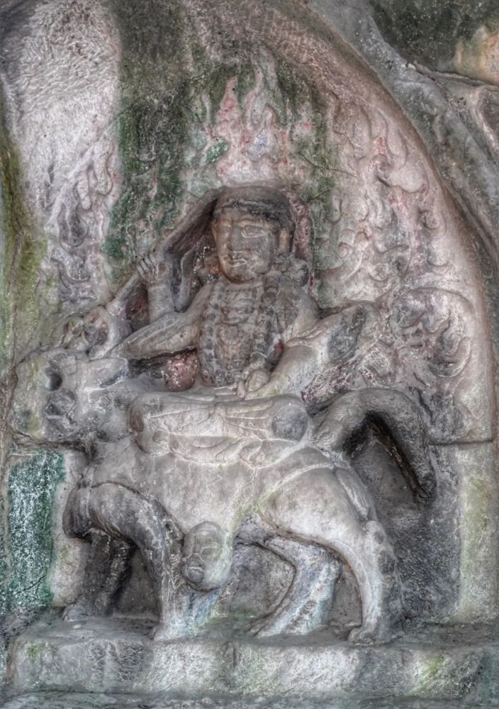 据史书记载,元朝皇帝对“大黑天”十分推崇,元世祖忽必烈迎请西藏高僧八思巴,封其为“国师”,据说八思巴就随身携带着一尊纯金铸的大黑天像。“大黑天”被尊为蒙古军队的保护神,蒙军征战时常把他的造像供在军中。作战前必先祭拜,以求战无不胜。元军攻克江南地区后,左卫亲军都指挥使伯家奴就奉命在吴山凿下了这尊造像,用来激励军队,祈求战争胜利。