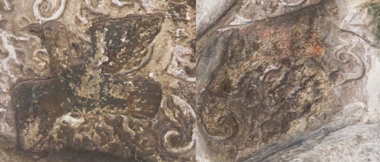 抬头可以看到,在龛楣的位置,雕刻着三只迦楼罗,也称金翅鸟。左右两边雕刻飞鸟和奔兽。它们象征着贪、嗔、痴“三毒”和烦恼、疾病的远离。