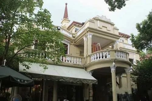 图为:黄楚九的家人当年在院落中的合影 三幢主楼中,有一幢是坐北朝南的奶黄色三层花园洋房,红色的洋瓦和屋顶的尖塔设计别具特色,二楼和三楼或圆或方的华丽阳台,以及丰富多样的欧式元素,充分展示了别墅的奢华气派。