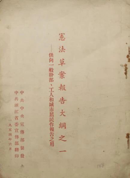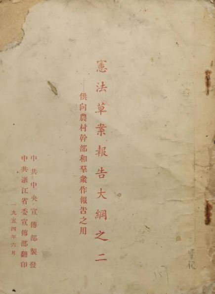 《宪法草案报告大纲》(1954年,中共中央宣传部制发、中共浙江省委宣传部印,现展出于“五四宪法”历史资料陈列馆北山街馆区第三单元)