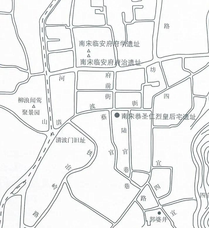 | 一、恭圣仁烈皇后宅的发现 2001年4月的一天,随着中大吴庄项目工程的推进,一座800年前的宋代园林重见天日。这就是恭圣仁烈皇后宅。 中大吴庄位于浙江省杭州市云居山北麓的缓坡上,海拔约9米。东临四宜路,西接蔡官巷北段,南起蔡官巷南段,北至清波街。沿清波街西行约200米,就到了南宋临安城的西南京城门—清波门的旧址,沿蔡官巷过清波街走府前街,北行约120米即为南宋临安府的府治遗址。