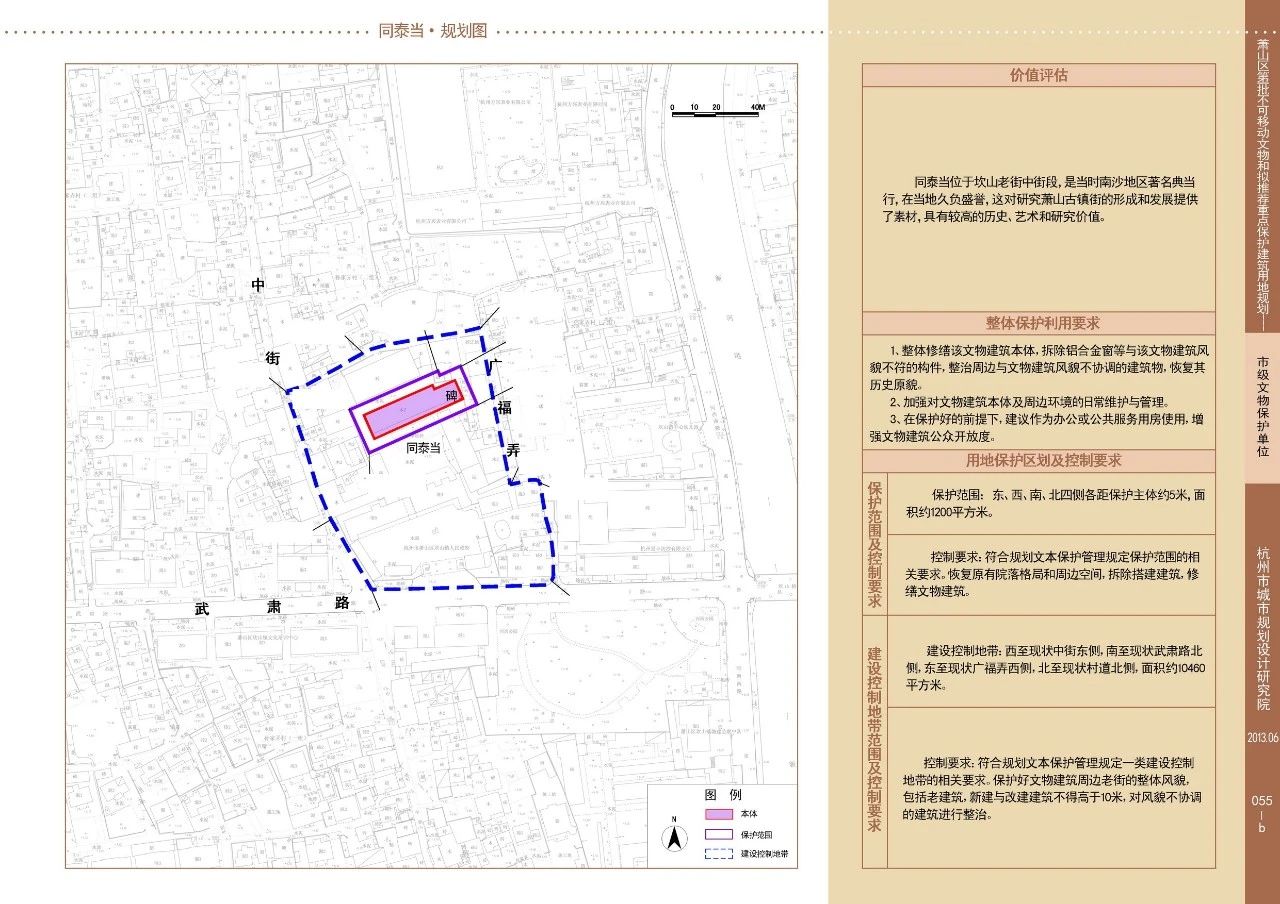 名 称:同泰当 地 址:萧山区瓜沥镇下街社区(原坎山镇人民政府内)类 别:古建筑 2 “ 文保单位简介 ” 同泰当始建于何年,尚无碑记和家谱可证,现建筑为坎山望族周渭珍、周达青兄弟店宅合一大院,约有200多年历史。 同泰当坐北朝南,为清代建筑,部分民国时期重建。原前后五进,现只存第四进。包括正厅和耳房,重檐两层楼。正厅面阔9间,耳房面阔3间。 同泰当位于坎山老街中街段,是当时南沙地区著名典当行,在当地久孚盛誉,对研究萧山古镇街的形成和发展提供了素材,具有较高的历史、艺术和科学价值。 3“ 保护图则 ”