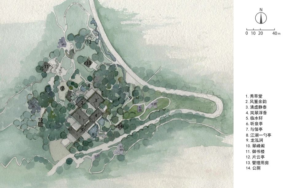 ▲龙井寺平面图 翁圣钧绘 北宋熙宁年间改名“寿圣院”,由苏东坡题额,南宋绍兴年间改名“广福院”,淳祐时赐名“延恩衍庆院”,即是如今俗称的龙井寺。明朝重建时,迁址到龙井旁,即现在所在的位置。故址如今被称为“老龙井”,有“十八棵御茶园”、“宋广福院”山门遗址、“宋蜡梅”等小景点。龙井寺现在成为宣传茶叶文化,品尝龙井茶的景点——龙井茶室,内有岚翠浮香、风篁余韵、清虚静泰、听泉亭、与偕亭、江湖一勺亭等。 ▲龙井寺平面图