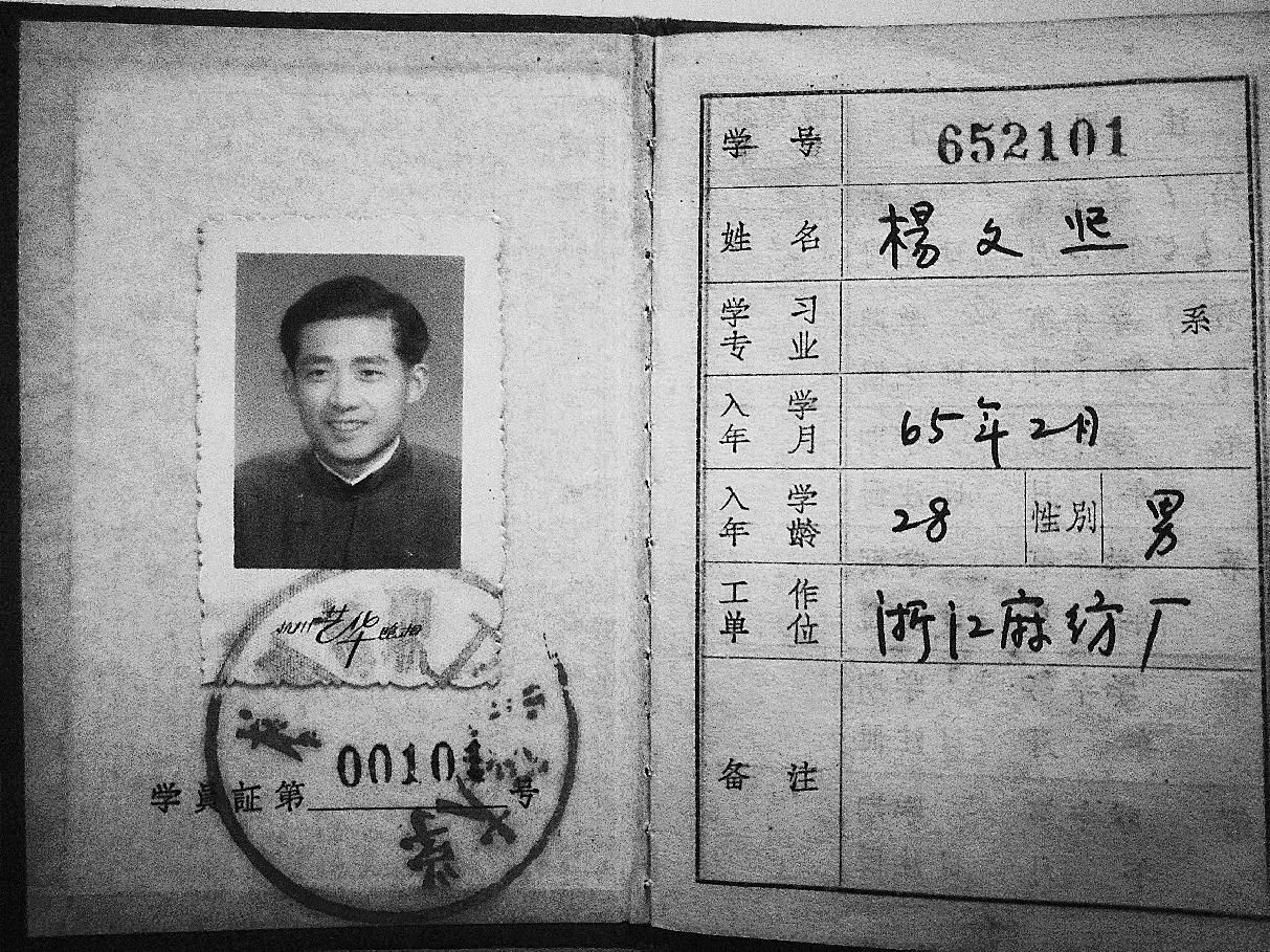 杨文熙在杭州职工业余大学的学员证 半工半读业余大学 1965年,我被厂里保送到杭州职工业余大学读书。我们是学校开办后的第一届学生。那个时候国家比较注重培养工人出身的知识分子,我们又是第一届,所以省市领导对我们都格外重视。我记得开学 典礼是在一个大礼堂里开的,当时浙江省教育厅厅长来为我们做开学报告。这在当时也算是蛮重要的一条新闻,《浙江日报》《杭州日报》都刊登在头版的。 “文革”的时候,大部分的学校都停课了,但是我们职工业余大学没有停。当时社会上很多老师都没有地方去上课了,我们学校就在这个空当让几位学生代表到浙大去请老师,浙大不少老师都愿意过来给我们上课。当时听到浙大的老师要来,我们都非常开心。老师课上得特别好,加之我们是技术工人出身嘛,所以课堂氛围比较活跃。