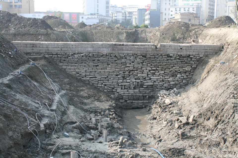 玉带河沿岸重点考古勘探工作尚在进行其中,蔡家塘东北、东南岸和蔡家塘至后沦桥之间的玉带河岸已完成,此区域所揭露的驳岸大致呈东西向,保存较好,岸线笔直,均为石块或石板砌筑。字民桥东侧的玉带河岸考古勘探已接近尾声,正在对做局部解剖。三板桥附近的考古勘探也正紧锣密鼓的进行中。