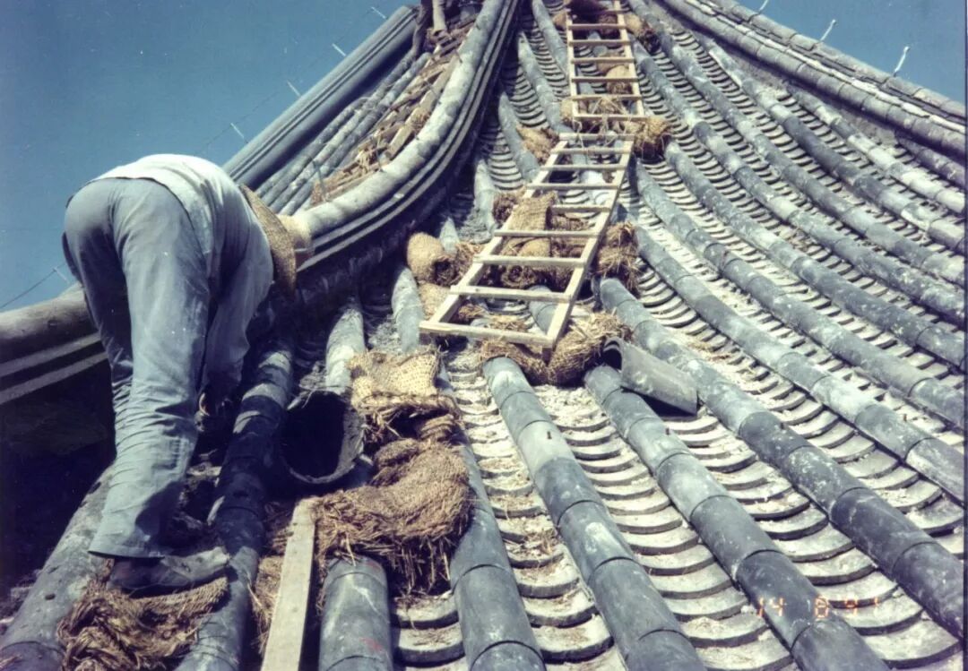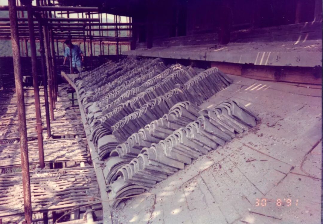 因地制宜,结合杭州特有的地理特性修缮六和塔,也是1991年这次大修的一个亮点。江南气候潮湿,六和塔朝山的一侧腐朽得厉害,屋面漏雨严重,揭瓦一看,里面的木头已溃烂至粉末状,所以要全部重修:清除朽烂的椽子,更换全部的望板及部分瓦件。