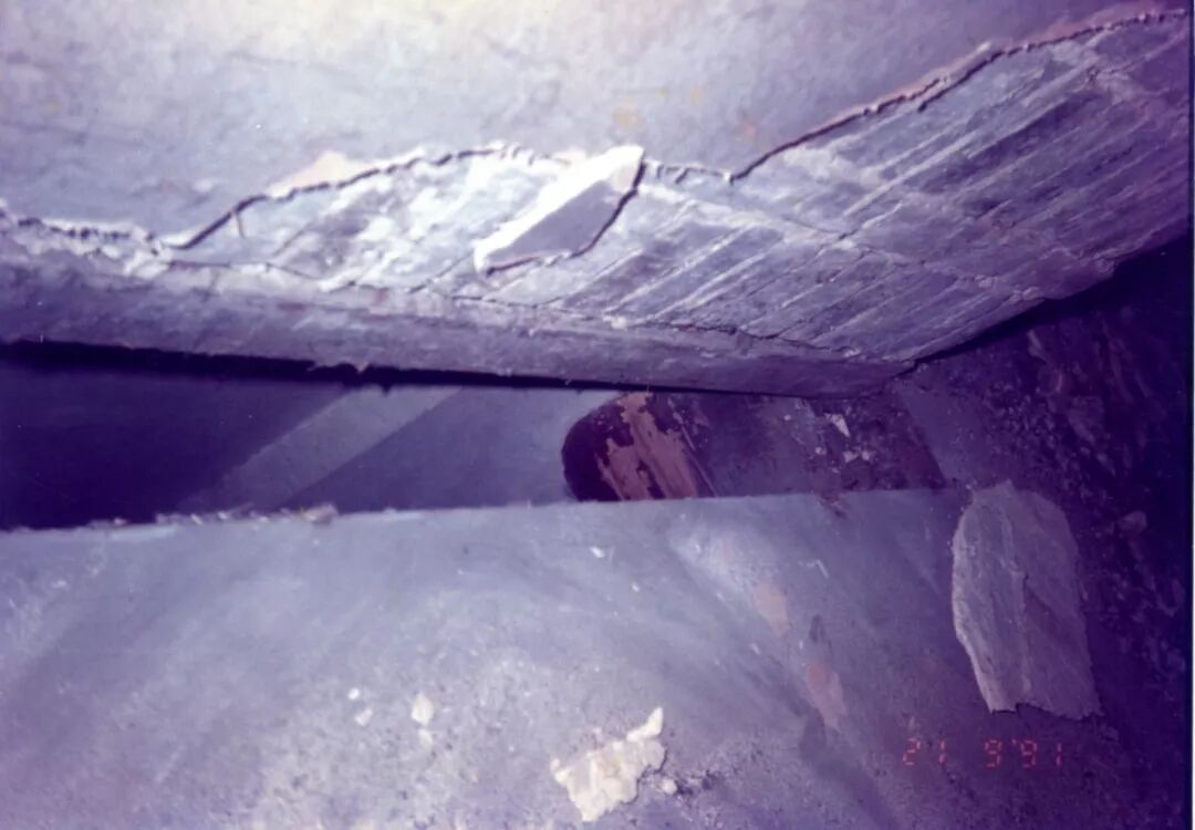 经再三研究,最后决定上钢箍子。在塔的上半部以8道钢箍箍紧,通过螺栓、钢板等连接件与梁尾相连系,阻止梁向外散脱,解决了梁拔出的问题。