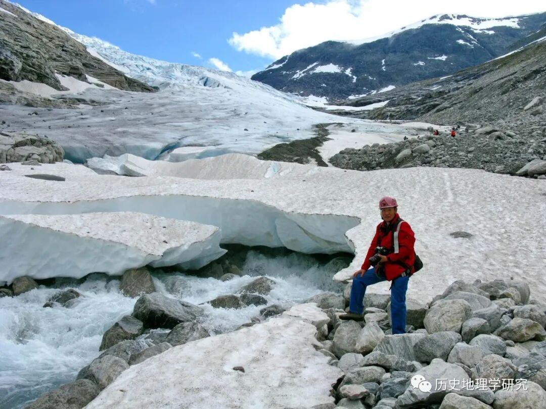 2015年李孝聪与藏族老汉 3、认路 如果说上述几项能力都可以通过逐渐领悟、感受、学习得来的话,那么“认路”这一能力似乎是来自先天。考察之中李孝聪师纠正司机驾驶路线的错误,或者大声说“车开错了”,而我们依然是一脸茫然,都是经常发生的事情。我们经常会将李孝聪师的这一能力归结于是“天份”,但如果仔细观察的话,实际上会发现这应当是李孝聪师一些多年习惯累积的结果,这些习惯中比较重要的有两点: 第一,事先以及考察途中对于地图的阅读。李孝聪师考察时经常随身携带大量的地图,在宾馆时他会在地图上对第二天考察的路线进行仔细的审对,在考察途中地图也基本不离手,这使其对行经的道路及其周边的地理景物烂熟于心。 第二,细致的观察。李孝聪师在考察中孜孜不倦的精神在上文已经提到,这里再举一个例子,我们坐飞机的时候,要不就是看书,要不就会休息,而李孝聪师大都依然在进行着他的“田野考察”,下面就是2012年某天他从武汉飞回北京时在飞机上进行“田野考察”时的两段笔录: 10:08,飞越河南省平舆县,河流穿城,保存一个很大的河中岛(江心洲)。黄河与淮河之间村落分布密集,小河流很多,有甚者夹河而成聚落。村落形态不规整,或河流环绕村庄,或村子中央有大水塘。接近郑州、开封时,村落面积相对比较大。 …… 10:58,飞经河北省饶阳县。在衡水市北孙口村,有一条支流汇入滏阳河,此河道或弯曲,或笔直,表明曾经有过裁弯取直工程。村落仍然沿着已经断流的旧河道分布,成为分辨古河道的标志。 …… 可能正是由于这种常年的观察,使其对交通道路、河流走向极为敏感,对于城市、村落的选址也归纳出一些规律(后文会谈到),加上对地图的熟悉,因此只要周围地理事物的变化与其头脑中抽像出的景观不同的话,那么李孝聪师就会敏锐的感到道路的选择可能发生了错误。 总体而言,跟随李孝聪师进行考察是一件即轻松又紧张的事情,轻松的是我们不会为错过考察地点、迷路而烦恼,紧张的是作为学生总是担心自己考察准备不够充份,在考察途中的所见所感追不上老师的思路,不过跟随李孝聪师的每次考察都会对自己的研究有所推进。 2011年6月21日李孝聪在挪威BRIKSDAL冰川