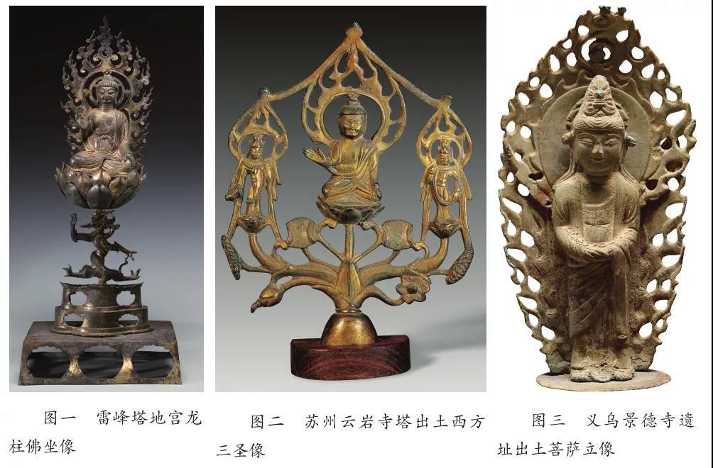 1、2001年杭州雷峰塔地宫出土金铜造像4尊:佛坐像3尊(图一),高4.5—68厘米;毗沙门天王立像1尊,高5.2厘米。2、2000年杭州雷峰塔遗址出土金铜造像2尊:佛坐像1尊,高18.3厘米;菩萨立像1尊,高14.9厘米。3、1957年苏州云岩寺塔出土金铜造像4尊:佛坐像1尊,高19.2厘米;一佛二菩萨“西方三圣”组像1尊(图二),高19.2厘米;十一面观音菩萨立像2尊,高23.5厘米。4、1984年义乌塘李乡景德寺遗址出土铜菩萨立像1尊,高26厘米(图三)。